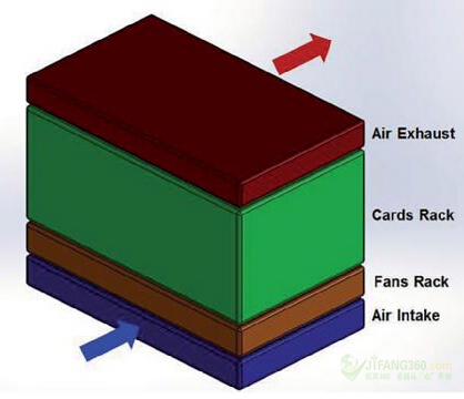 冷却系统的组织,是为了使其符合机架供应商的标准。如图1所示,其显示了91看片神器APP最终的设计草图。进气口是在前端的底部,而空气的排出口是在顶部的背面或顶部。空气流是从机架的底部流到顶部。最小空气流量为每秒0.2立方米(m3/s)或420立方英尺每分钟(cfm)。这一空气流被定义了,以便该系统将能够与现有的卡和机架向后兼容。机架的大小被固定在大约0.4 m x 0.44 m x 0.25 m (H x W x D),这意味着系统中的空气每秒将被替换约四次。